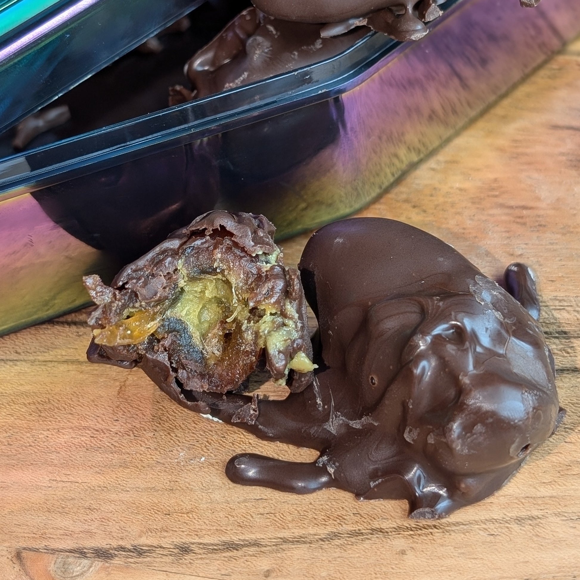 Indulge in the unique taste of Chocolate Bugs, made with sweet dates, pistachio butter, and rich dark chocolate. Each piece resembles a cute and crunchy bug candy, making it a fun and delicious treat for all ages. Satisfy your sweet cravings in a fun and wholesome way with Chocolate Bugs.