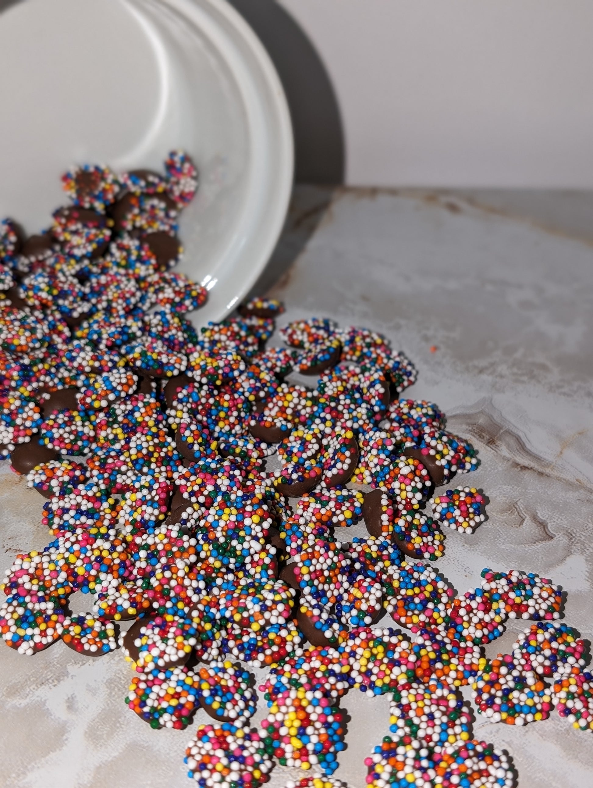 Mountain Tops are a classic nonpareil reimagined for a Modern Appalachian Kitchen. This milk chocolate treat is loaded with nonpareils sprinkles.