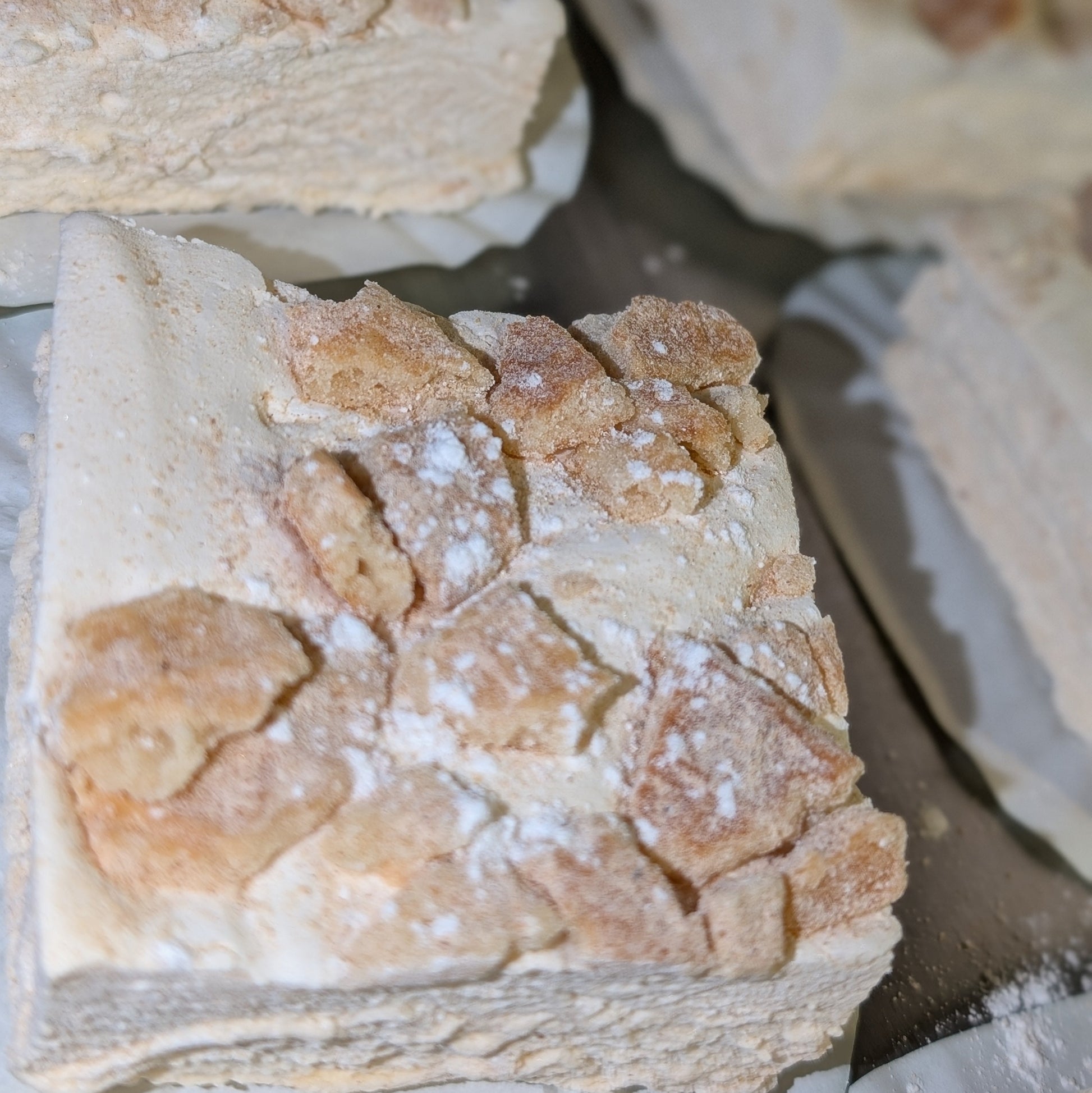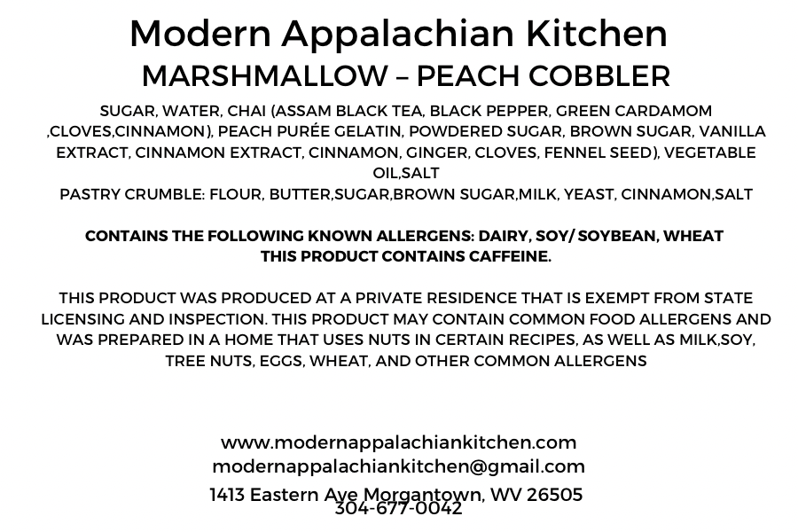 Experience the Peach Cobbler Marshmallow, a delicious blend of chai spices and fresh peach purée. Each marshmallow is coated in chai powdered sugar and topped with a buttery pastry crumble, delivering a perfect balance of warm spice and sweet fruit. This indulgent treat brings the comforting flavors of peach cobbler to a soft, fluffy delight you won’t want to miss.