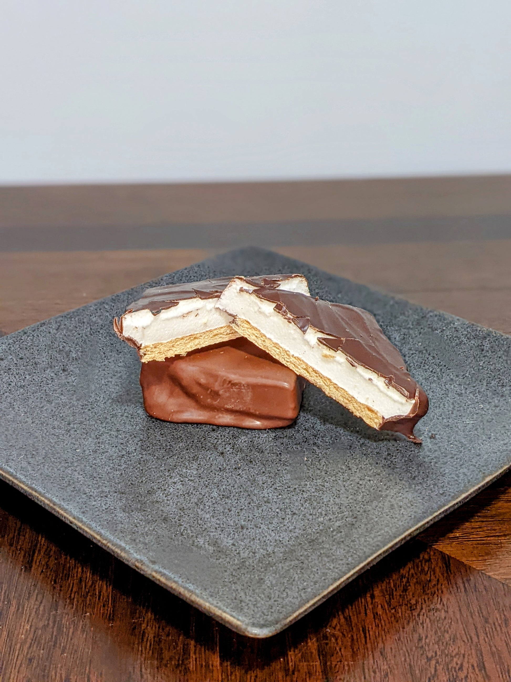 Our S’more Squares start with our vanilla marshmallow. The marshmallow is placed on top of a honey graham cracker and coated in milk or dark chocolate.